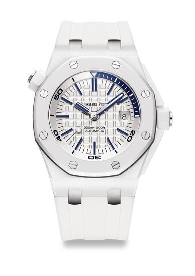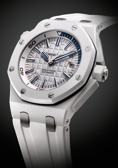 爱彼不仅预先推出搭配钛金属表壳、白色陶瓷表圈、按钮、表冠和机芯夹板的皇家橡树格林威治标准时间概念陀飞轮腕表(见“专业工艺”媒体资料),还带来了这款出众的皇家橡树离岸型系列Diver 潜水腕表,其中包括迷人的白色设计和超硬复合材质,实属探索海洋深处的最佳伴侣。