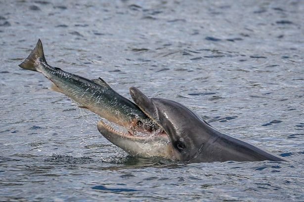 据英国《每日镜报》报道,英国40岁的导游萨拉·佩恩(Sarah Pern)在苏格兰东海岸拍到到宽吻海豚捕食大马哈鱼的精彩一幕。照片显示,一条大马哈鱼刚跃到空中,一只宽吻海豚随即冲出海面,将大马哈鱼吞入口中。
