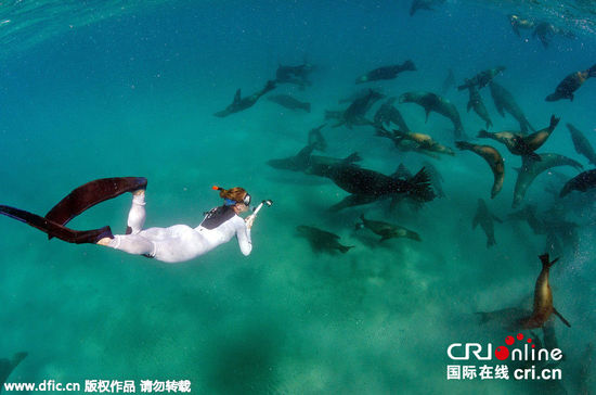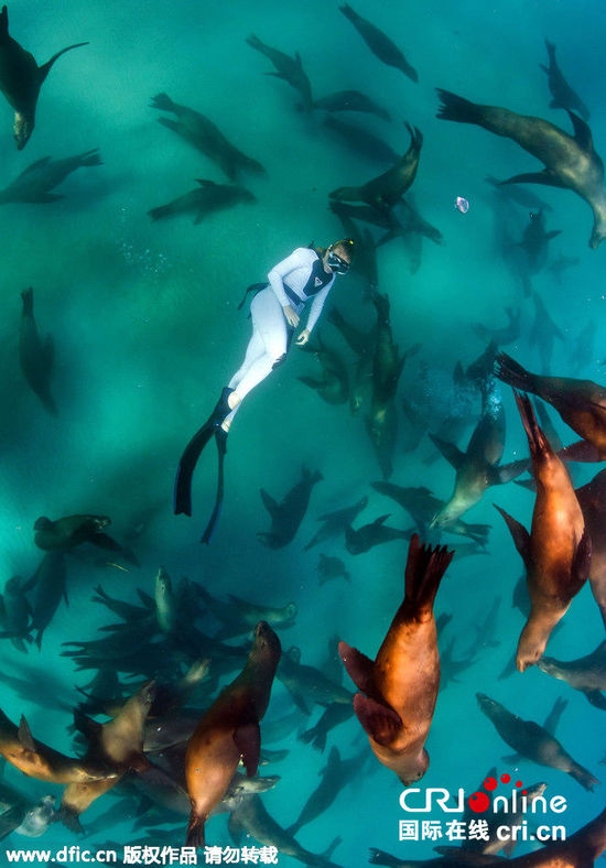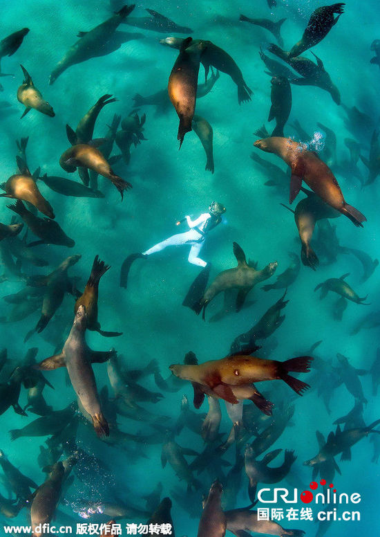 墨西哥女潜水员与巨大海狮群水下浪漫“共舞”,当地时间2015年5月27日报道,想象一下,能和世界上最友好的生物一起戏水的场景能有多么地神奇。墨西哥一名女潜水员梦想成真了,近距离和巨大的海狮群亲密接触,水下浪漫“共舞”。图片来源:东方本文来源:国际在线